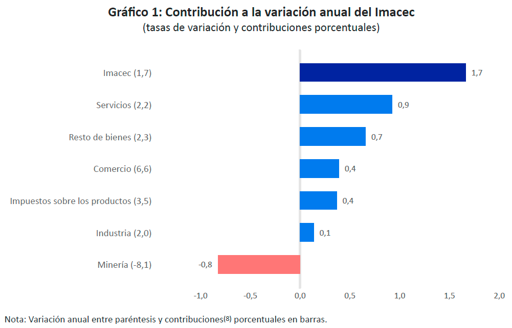 El Banco Central informó que el Índice Mensual de Actividad Económica (Imacec), estimación que compara actividad económica (minería, industria manufacturera, resto de bienes, comercio y servicios) en un determinado mes a precios del año anterior, en diciembre de 2025 registró un crecimiento de 1,7% en comparación con el mismo mes del año anterior. Este resultado positivo se explica principalmente por el dinamismo en los sectores de servicios y comercio, logrando compensar la baja producción minera que marcó el cierre del cuarto trimestre.