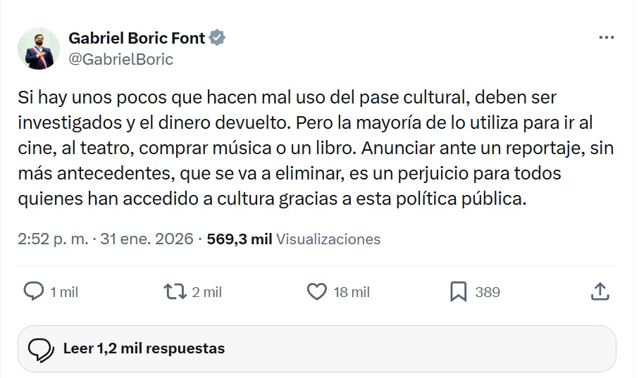 A pesar de las críticas, desde el Ejecutivo aseguran que los casos de fraude no representan la norma. Mediante un comunicado, el Ministerio afirmó que el pase ha sido activado por 94 mil personas y ha permitido comprar libros, instrumentos y asistir a teatros. El Presidente Boric también defendió la medida en sus redes sociales: