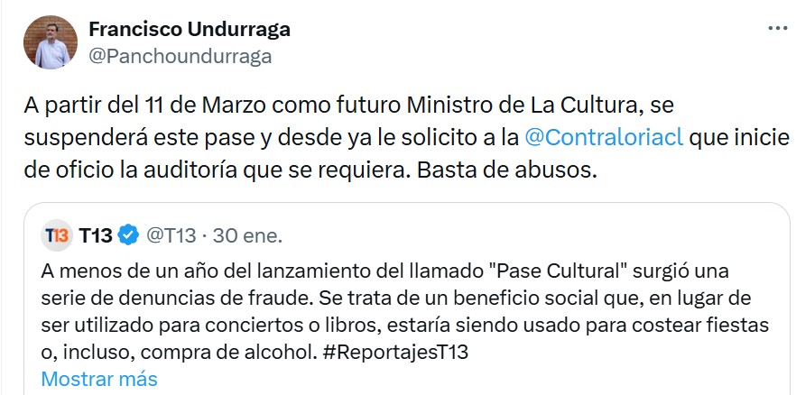 “A partir del 11 de marzo como futuro Ministro de las Culturas, se suspenderá este pase y desde ya le solicito a la Contraloría que inicie de oficio la auditoría que se requiera. Basta de abusos”, indicó.